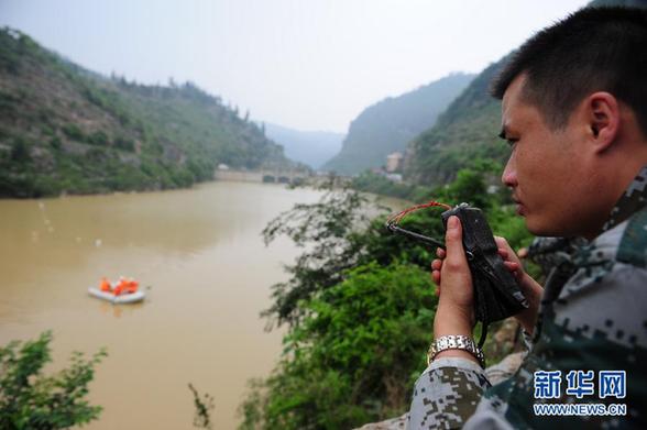 6月18日,救援人員在事故現場與水下的潛水員通話。
