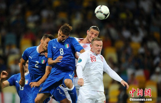 當地時間24日晚,2012年歐洲杯進行了最后一場四分之一決賽。最終,意大利隊(藍衣)在點球大戰中4比2戰勝英格蘭隊,鎖定最后一個四強席位。圖為爭搶頭球。