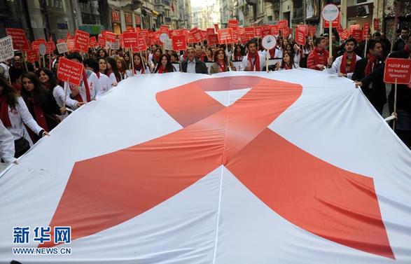 2011年12月1日,在土耳其伊斯坦布爾的自由大街,市民高舉標語游行紀念艾滋病日。