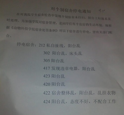 ????在這份處罰條例后邊,網上還上傳了一份遭到處罰的宿舍名單,遭到處罰的八間宿舍因為“陽臺亂、宿舍整體亂、態度不好”等原因被處以停電三天的處罰,按照“宿舍處罰條例”要在三天內對這幾間宿舍進行檢查,如果不合格,停電時間就將進行累加。