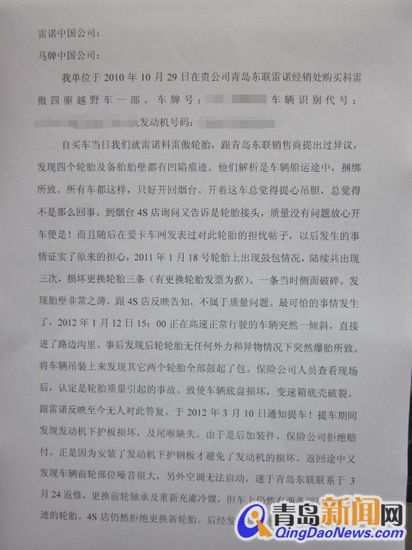 青島東聯雷諾4S店:“諾相隨”只對質量問題車輛 建議找“馬牌”申訴