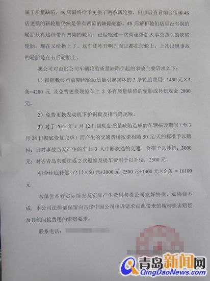 記者又聯系了青島東聯雷諾4S店,負責售后索賠的一位工作人員崔女士表示:“李先生的車在青島前后保養、維修過三次,而大部分時間其實是在煙臺做車輛養護的。在李先生的車出事故之前,車胎曾有過鼓包,李先生自己找到雷諾車使用的輪胎廠家馬牌,更換了三條車胎,所以發生事故后車胎再有問題,已不是雷諾的出廠車胎了,即使向廠家申訴也不能更換。另外,廠家現在也沒有車胎的鑒定資格,車主想鑒定車胎,只能找大型輪胎廠察看,或向馬牌輪胎廠家申訴協調。”
