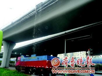 ????原本應(yīng)從管道流向地面的高架橋雨水,卻從十多米的高空直接排下,造成地面積水嚴(yán)重,行人、車輛通行困難。對(duì)于莘縣路附近高架橋直排雨水一事,5日,施工單位稱,雨水是從橋面伸縮縫排出,橋面整體鋪瀝青才能解決。