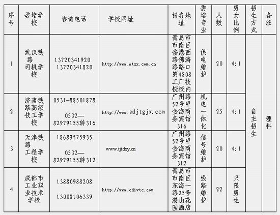 ????青島新聞網7月16日訊? 為滿足青島地鐵開通運營人才需求,武漢鐵路司機學校、成都市工業職業技術學校、濟南鐵路高級技工學校、天津鐵路工程學校計劃在青島市域范圍內定向招收87名地鐵運營專業技術委培生,在校學習時間三年,招生對象為2012年應屆高中畢業生。