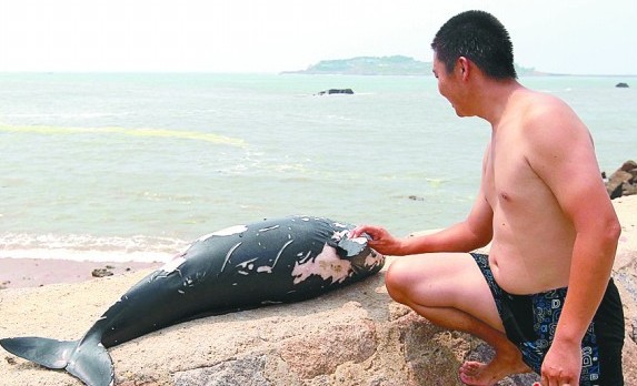 ????19日10時許,尚先生跟朋友在極地海洋世界西南側海邊垂釣時,突然發現距離岸邊數十米遠的海面上漂浮著一條黑色“大魚”。尚先生涉險下海將其撈起來,發現是一條體表傷痕累累的已死亡的小江豚。