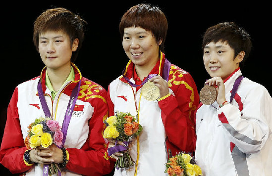 2012年8月1日,倫敦奧運會,乒球女單內戰,李曉霞(中)力克丁寧(左)奪冠。新加坡馮天薇獲得銅牌。