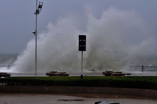 達維過境青島小驚 護欄刮倒巨浪狂拍石老人(組圖)