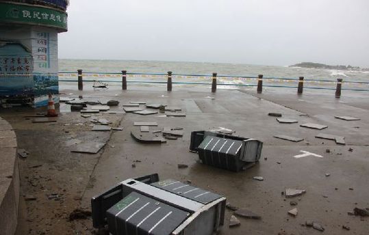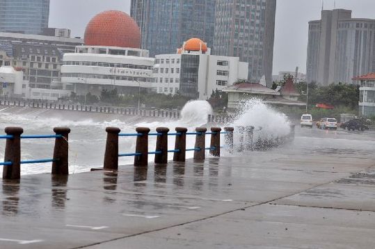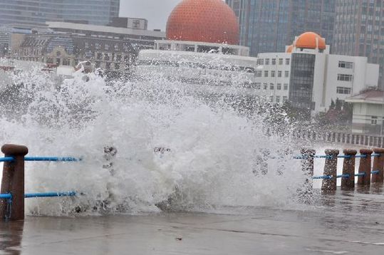 達維過境青島小驚 護欄刮倒巨浪狂拍石老人(組圖)