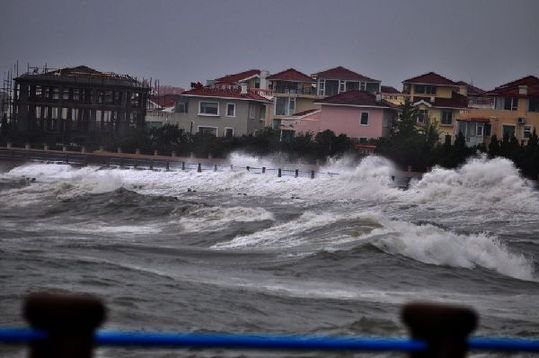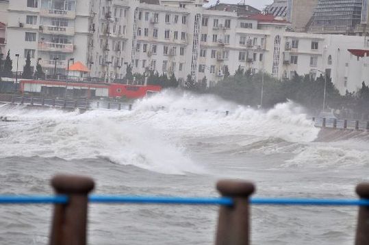 達維過境青島小驚 護欄刮倒巨浪狂拍石老人(組圖)