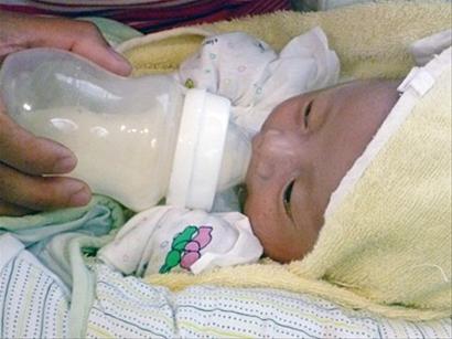 下午1時30分,恩永到了喂奶的時間,趙祥海不斷地試著奶瓶中水的溫度,到適宜溫度后再加入奶粉,“先是一勺,再是半勺。”奶粉沖好后,恩永的舅媽坐在椅子上輕輕地抱著他,按照醫生說的方式喂奶,恩永很滿足地吸吮著,還不時伸小手向外抓幾下,整個喂奶過程沒有發生嗆奶。