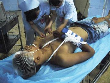 昨天上午記者趕到401醫院腹外科時,小超剛剛做完手術。只見他頭上撞開一道血口縫了五六針,臉頰、