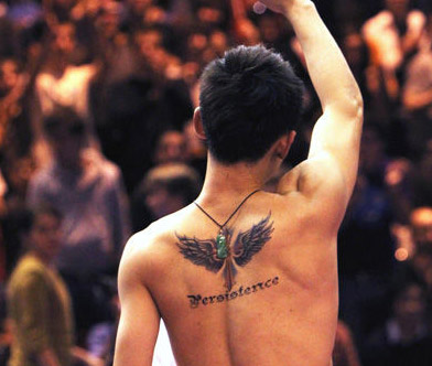 ????張繼科背后那展翅高飛的圖案,正是他的心愿。“persistence”的英文,意思是堅持、毅力,在他的心中就是持之以恒。這樣的寓意,是他對自己的激勵,更是對自己的期待。文身,放在普通的年輕人身上,也許并不會引起太多的關注,但在國乒這支紀律嚴明、管理嚴格的隊伍中,張繼科多少顯得有些另類。其他隊員想都不敢想的事情,而張繼科不僅敢想,還付諸行動了。這就是他的個性,被劉國梁稱為“藏獒”的血性。