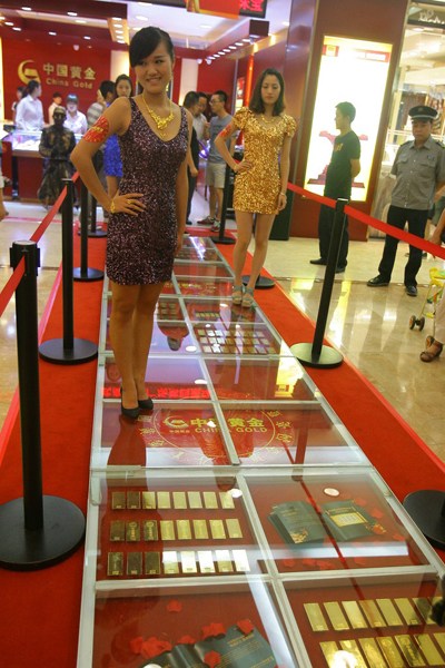 8月5日,武漢一商家用了200公斤純黃金金磚“鋪”成“金光大道”,引來眾多市民“踩金”。