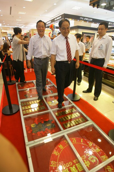 8月5日,武漢一商家用了200公斤純黃金金磚“鋪”成“金光大道”,引來眾多市民“踩金”。