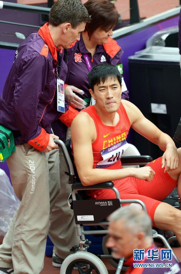 8月7日,中國選手劉翔(右)受傷后,被工作人員用輪椅推出賽場。