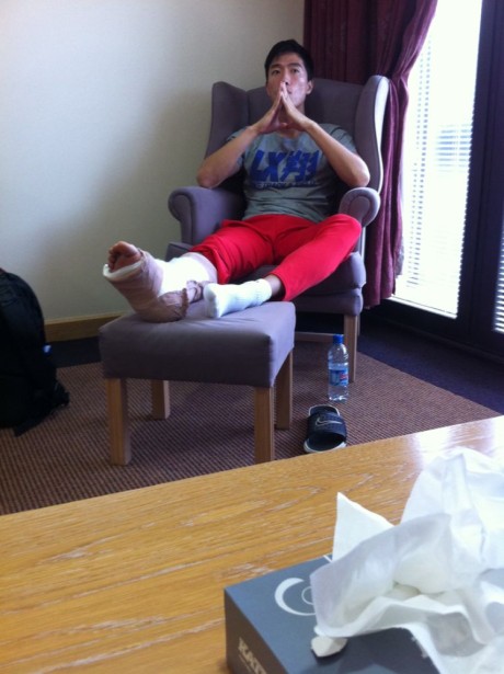 ????在抵達醫院后,翔爸翔媽也終于見到了兒子,騰訊記者王正根也成為飛人在傷后首度與父母見面的見證人,王正根在微博中寫道:來到醫院,見到父母,翔眼眶也濕潤了!同時他還配上了一張劉翔的圖片,在圖中可見劉翔雙手并攏在臉前,而受傷的右腳跟腱則被厚厚的繃帶所包裹。