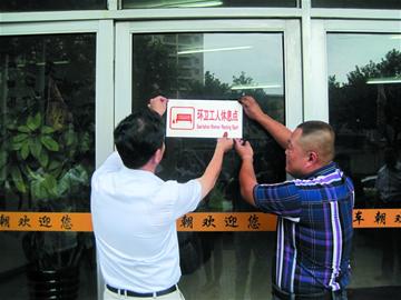 青島晚報和市政公用局聯辦的“咱給環衛工,添些休息點”活動啟動以來,不少商鋪紛紛打來熱線電話咨詢報名,想加盟“歇腳點”。昨天上午,市政公用局在車朝汽車俱樂部懸掛了首個“環衛工人休息點”的標識牌,并將給已報名的230余家店鋪按照報名先后順序陸續懸掛標志。從昨天起,環衛工人看見這個標識牌,就可以進去歇腳。另外市政公用局歡迎沿街商鋪繼續報名參加,年底將對各個歇腳點進行表彰。