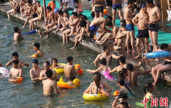 近日,全國多地遭遇高溫酷暑天氣,炎炎烈日下,人們紛紛亮出避暑遮陽高招。5月27日,山東濟南,在省城解放閣底下泉水浴場人滿為患。當日最高氣溫升至32.8度。