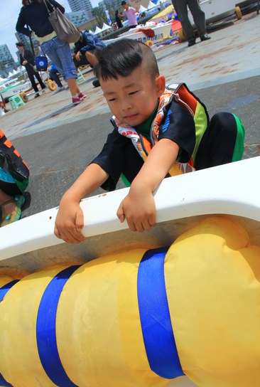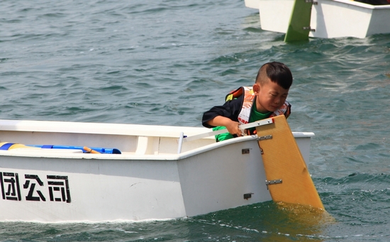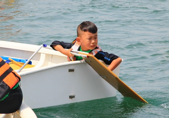 本次女子組的比賽現場,卻一位留著可愛瓜瓢頭的小男孩得到了全場的格外關注,他體型特別瘦小,大腦袋,曬得黑黑的,出發前緊緊抓著船舷,緊張的樣子萌態十足,現場觀眾們都叫他“小蘿卜頭”。記者了解到,這是本次比賽最小的選手,只有4歲,名叫多多,來自南京。之前的訓練都在南京的玄武湖,這是他第一次到大海中航行。記者問,緊張嗎?多多皺著眉頭考慮了一下,然后鄭重的點點頭。