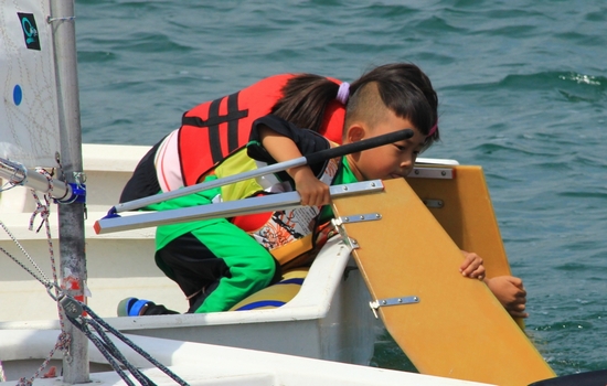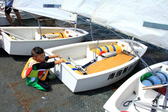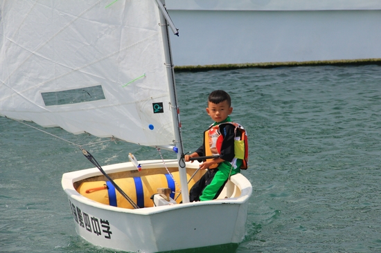 四歲的OP帆船小選手多多來自南京,這是他第一次揚帆大海,之前的訓練都在玄武湖里進行