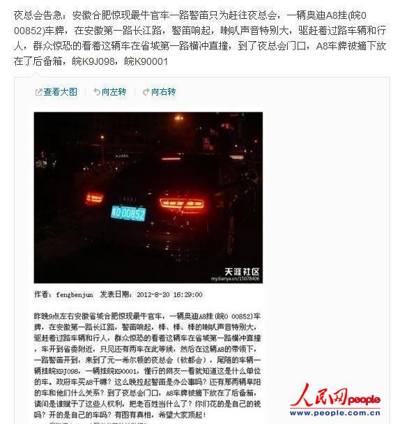 實名認證網友@興賢堂轉天涯爆料帖稱,19日晚9點左右,安徽合肥驚現“最牛官車”,一輛奧迪A8掛著皖O 00852的車牌,在“安徽第一路”長江路上鳴警笛,“棒棒棒的喇叭聲音特別大,驅趕著過路車輛和行人”。車開到安徽省委附近,有兩輛牌照分別為皖K90001與皖K9J098的轎車在此等候。在奧迪A8的開道下,三輛車開至欽都會夜總會。到夜總會門口后,A8車牌被摘下放在了后備箱。網帖還提到,“懂行的網友一看就知道這牌照是什么單位的,有圖有真相,請問是誰賦予了這些人權力?”