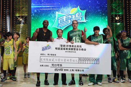 ????賽后,可口可樂大中華區(qū)市場、客戶及商務領導力首席執(zhí)行官傅博偉先生協(xié)同周杰倫及科比?布萊恩特將當晚門票的全部收入人民幣2,621,105.99元悉數(shù)捐贈給了中國青少年發(fā)展基金會,用于資助希望小學改善籃球運動設施并普及籃球運動。