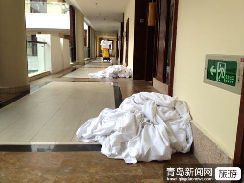 ????當(dāng)記者來到入住的房間后,卻發(fā)現(xiàn)房間并未收拾,上一波客人走后留下的垃圾還在地上,床鋪也是凌亂不堪。房間門口還堆著一地等待清洗的床單被罩。記者一行只好抱著行李繼續(xù)站在房間門口等待,期間并沒有任何工作人員詢問記者是否需要幫助。再等待半個(gè)小時(shí)之后,酒店工作人員才將房間打掃完畢,此時(shí)已是下午4點(diǎn)20分。