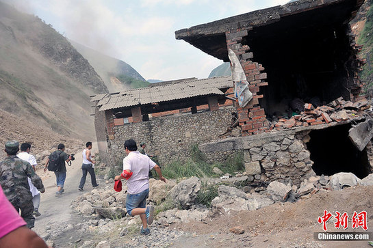 9月8日,云南彝良地震震中洛澤河鎮附近道路上,不斷發生的余震引發山體落石。截止8日早上8時,云南彝良地震災區發生余震161次,最大余震4.4級。圖為余震發生時,山腳邊的民眾奔向安全地帶。