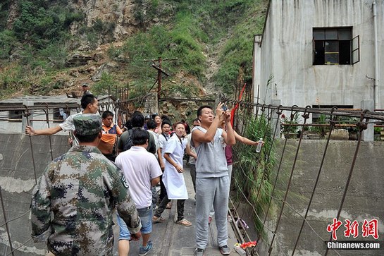 9月8日,云南彝良地震震中洛澤河鎮附近,不斷發生的余震引發山體落石。截止8日早上8時,云南彝良地震災區發生余震161次,最大余震4.4級。圖為緊急疏散至安全地帶的災區民眾。劉冉陽攝