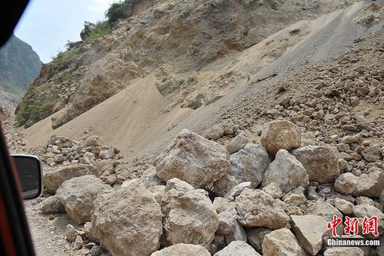 9月8日,云南彝良地震震中洛澤河鎮附近道路上,不斷發生的余震引發山體落石。截止8日早上8時,云南彝良地震災區發生余震161次,最大余震4.4級。劉冉陽攝