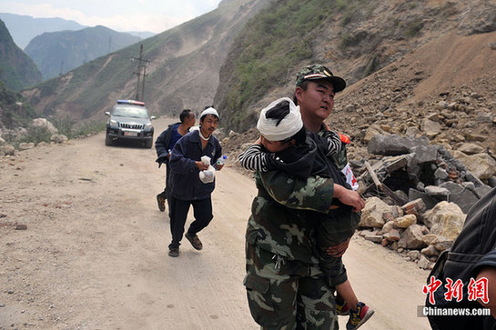 9月8日,參與云南彝良地震救援的武警官兵將受傷的兒童安全區域轉移。劉冉陽 攝