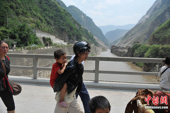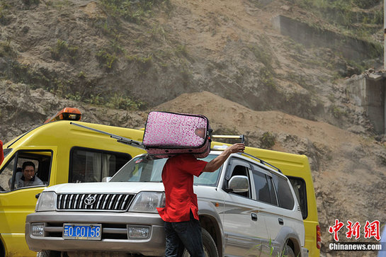 9月8日,云南彝良地震震中洛澤河鎮附近道路上,不斷發生的余震引發山體落石。截止8日早上8時,云南彝良地震災區發生余震161次,最大余震4.4級。圖為余震發生時,緊急疏散至安全地帶的災區民眾。劉冉陽攝