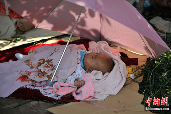 9月8日,云南彝良地震震中民眾逐步向安全區域轉移。據不完全統計,截至目前云南彝良地震已經造成了80人死亡,795人受傷,有74.4萬人受災。圖為安置點內熟睡的兒童。劉冉陽攝