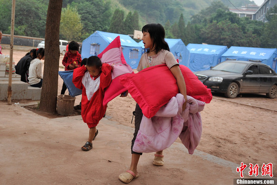 9月8日清晨,云南彝良地震震中所在地洛澤河鎮。該鎮毛坪中學是此次地震災區一個重要的民眾安置點。洛澤河鎮政府稱,9月7日中午發生的地震已經造成該鎮49人遇難。圖為正在搬運被褥的兒童。劉冉陽 攝