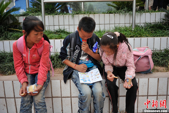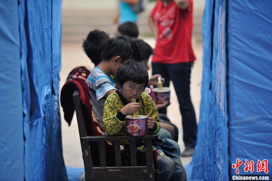 9月8日清晨,云南彝良地震震中所在地洛澤河鎮。該鎮毛坪中學是此次地震災區一個重要的民眾安置點。洛澤河鎮政府稱,9月7日中午發生的地震已經造成該鎮49人遇難。圖為正在帳篷外吃方便面的兒童。劉冉陽 攝
