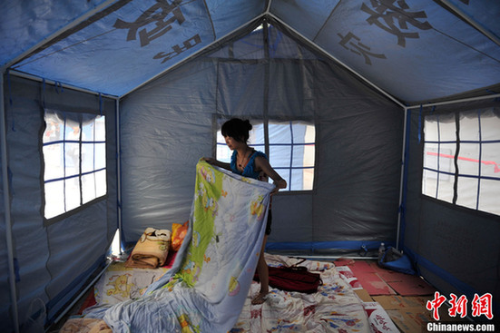 9月8日清晨,云南彝良地震震中所在地洛澤河鎮。該鎮毛坪中學是此次地震災區一個重要的民眾安置點。洛澤河鎮政府稱,9月7日中午發生的地震已經造成該鎮49人遇難。圖為正在帳篷里疊被子的民眾。劉冉陽攝