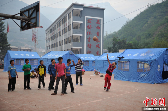 9月8日清晨,云南彝良地震震中所在地洛澤河鎮。該鎮毛坪中學是此次地震災區一個重要的民眾安置點。洛澤河鎮政府稱,9月7日中午發生的地震已經造成該鎮49人遇難。圖為正在帳篷外打球的兒童。劉冉陽 攝