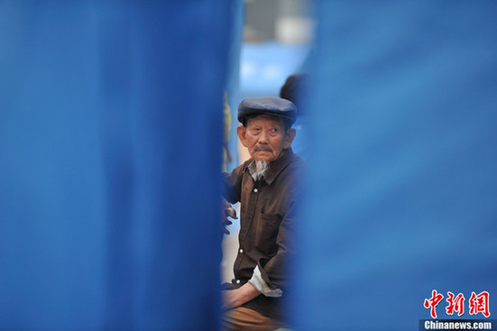 9月8日清晨,云南彝良地震震中所在地洛澤河鎮。該鎮毛坪中學是此次地震災區一個重要的民眾安置點。洛澤河鎮政府稱,9月7日中午發生的地震已經造成該鎮49人遇難。圖為坐在帳篷外的當地老人。劉冉陽攝