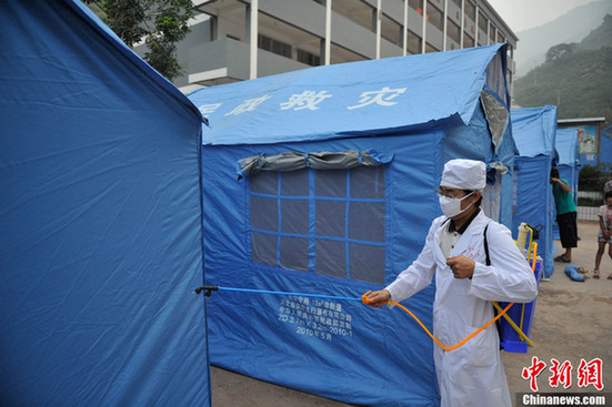 9月8日晨,發生在云南彝良縣的地震已造成當地80人死亡,795人受傷,74.4萬人受災。圖為當地的居民安置點正在開展消毒防疫工作。顧一行攝