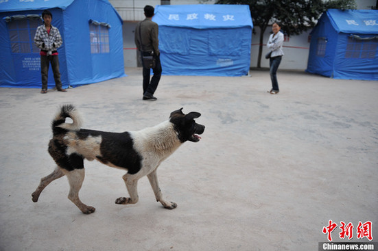 9月8日清晨,云南彝良地震震中所在地洛澤河鎮,毛坪中學安置點的民眾很早就起來。圖為洛澤河鎮衛生院的醫生開始進行消毒防疫工作。圖為一只狗跟隨主人在校園里走動。劉冉陽攝