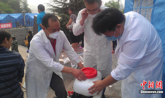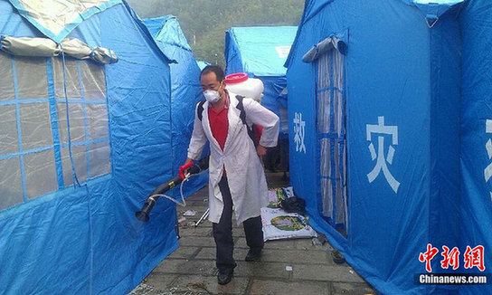 9月8日清晨,云南彝良地震震中所在地洛澤河鎮。該鎮毛坪中學是此次地震災區一個重要的民眾安置點。洛澤河鎮政府稱,9月7日中午發生的地震已經造成該鎮49人遇難。圖為洛澤河鎮衛生院的醫生開始進行消毒防疫工作。劉冉陽攝