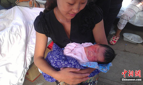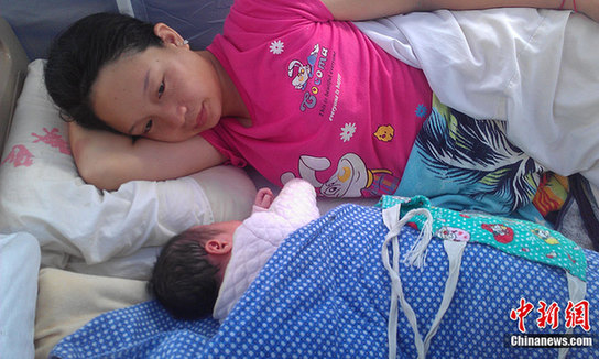 9月8日清晨,云南省彝良縣人民醫院,這里是此次地震的災民安置點之一。圖為8日凌晨在帳篷中出生的嬰兒躺在母親身邊。中新社發顧一行 攝