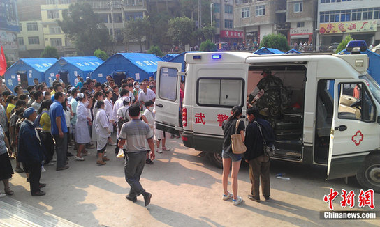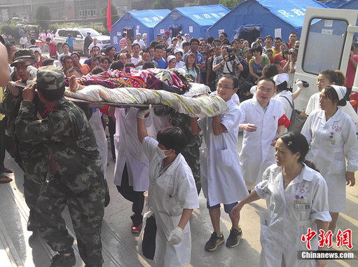 9月8日清晨,云南省彝良地震中的傷員被送往縣人民醫院進行救治。目前,該院已收治81名地震傷員,多為頭顱外商、骨折。中新社發顧一行 攝