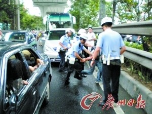 廣州市公安交警部門通報:9月7日17時30時許,民警在東風西路康王路口查扣一輛涉嫌無證駕駛和有被盜搶嫌疑的小型汽車(車輛號牌:粵NM22××)時,該車駕駛人曾某某抗法后逃逸,后被執勤交警在內環路B線市一中入口處截停并制服。