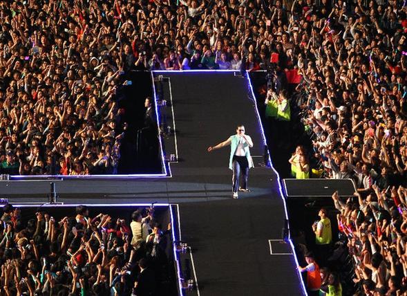 新華社照片,首爾,2012年10月5日(晚報(bào))(3)韓國8萬觀眾現(xiàn)場(chǎng)觀看《江南Style》演唱會(huì)10月4日,韓國歌手樸載相(也稱Psy)在韓國首爾廣場(chǎng)上表演。當(dāng)日,憑借一曲《江南Style》風(fēng)靡多國的韓國流行歌壇老將樸載相(也稱Psy)在韓國首爾廣場(chǎng)舉行免費(fèi)演唱會(huì),吸引了約8萬名觀眾。《江南Style》一歌在一家知名視頻網(wǎng)站上的點(diǎn)擊率已超過3.6億人次,并登上“英國官方排行榜公司