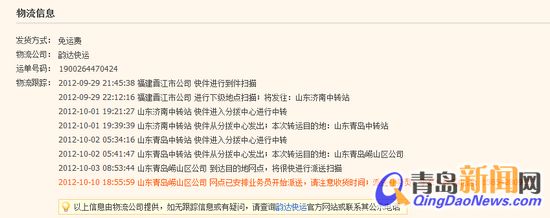 ????像張女士這樣的網友還有許多,另有一位荊先生,也被這份“晚點”的快遞折騰了一番。他說:“9月29日,賣家發貨,直到10月3日,記錄停在‘山東青島嶗山區公司 到達目的地網店,將很快進行派送掃描’,通常按約定從福建到青島,最多三四天即能到貨,而這次不知是出了什么問題。于是,我打電話詢問了韻達快遞總部,對方稱具體情況不詳,嶗山站的地址也不清楚。后來,我又從網站上查到了青島嶗山區公司的電話,前后撥打了20余次,一次都沒有打通過。最后又過了六七天,10月10日,在追單記錄上更新了一條,出現了派送業務員的電話,我撥打五六次始終無法接通,要不便是不接電話。現在已經是10月15日了,貨品還滯留在業務員手上,自己去提貨又不行,真讓人著急。”