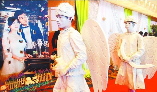 ????11月10日,黑龍江中路一家星級酒店內,前來參加婚禮的賓客被婚宴上的“活體雕塑”吸引住,紛紛拍照合影。記者看到,當天婚禮上出現的“活體雕塑”有兩種:一種是全身涂成白色的天使,負責引導賓客入席;一種是涂滿黑色和銅色顏料的金童玉女,負責指引來賓簽到。 記者 何毅