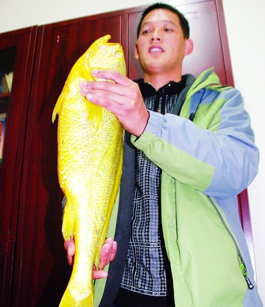 ????11月11日,膠南某水產公司一位漁民在膠南的外海撈出一條金色的大魚,這條魚長62厘米,重4斤6兩,全身金黃。漁民剛開始以為是大黃花魚,不過,經過黃海水產研究所的魚類史專家鑒定,初步認為是黃唇魚的可能性比較大,這種魚的經濟價值很高。