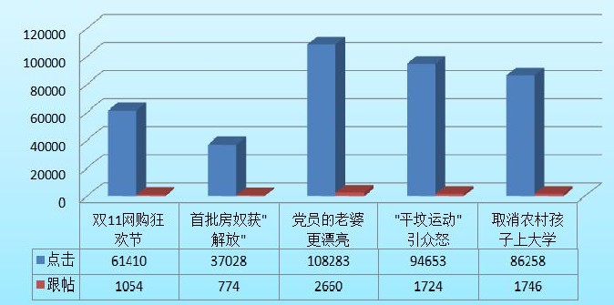 ????1、雙11網購狂歡節 ????近日,關于“雙11網購狂歡節”的話題不絕于耳。原本以為搶得‘盆滿缽滿’的網友們一覺醒來發現,自己拍下的商品無法按時發貨,商家以‘訂單無效’的說法而強制給網友們退了款。網購狂歡節遭強制退款,淘寶被指欺詐,于私傷害的是網民,于公傷害的是網購游戲規則。網民認為:商家既然推出五折狂購的活動,并以此為噱頭進行促銷,就應保證在活動期間的正常交易?!半p11節”狂歡后,網絡上關注更多的是關于對企業誠信問題的思考。 ????2、首批房奴獲“解放” ????12日,媒體報道,首批房貸將迎來清款大限。有媒體甚至愉悅地喊出“房奴解放了!” 。對此,來自天涯的網友“四川曾穎”則表達了不同看法:高房價依舊還在毀滅人們的愛情和夢想。很多人還在睜眼就欠銀行幾百元的陰影里,過著“不敢娛樂,不敢旅游,不敢生病,不敢跳槽,不敢失業,甚至不敢要孩子”的生活,這種被房子征服,切斷了所有退路的生活,并不會因為少數還清了貸款的購房者,而徹底改變。公眾最害怕的,莫過于這條新聞被誤讀成為“利好”,而使調控政策受到衰減和松動。 ???3、共產黨員的老婆更漂亮 ????十八大期間,有代表談腐敗,有代表說拆遷,更有俞正聲、汪洋等代表委員直面財產公開問題,引來網友一片贊賞。11月11日,十八大代表梁穩根接受媒體采訪時表示:“共產黨員的老婆要比非黨員的老婆要漂亮一些”的言論卻遭到了很多網友的質疑。有網民直言:共產黨員的理想,歸根結底是以組織為重、以人民群眾利益為重。入黨的目的,不是為了找個漂亮老婆,而是聽黨號召,最大程度為人民服務。不管老婆漂亮與否,不應該是衡量一個人的標準,更不應該是黨員“理想”的表現。 ????4、河南周口“平墳運動”激起民眾反感 ????近日媒體報道,河南省周口市今年開展了大規模平墳復耕和殯葬改革,目前已平遷200多萬座墳墓,復種耕地近3萬畝。由于部分地區強制平墳,公墓建設簡陋,平墳工作也遭到一些反對和質疑。當地群眾一些反對者認為:每年河南省官方都要耗資數以億計舉行祭祖大典、儀式,這種“文化搭臺、經濟唱戲”的做法姑且不去商榷,但只許官員祭祖,不許百姓上墳,難以讓百姓信服。評論指出,在關乎百姓切身利益的重大問題上,地方政府如果不能認真聽取群眾意見,“平墳運動”可能平掉的是人民對政府的信心。 ????5、政協委員建議:取消農村孩子上大學資格 ????近日網上流傳著全國政協委員王平建向中央建議:取消錄取農村小孩上大學資格,反對農村小孩上大學。此言一出,輿論一片嘩然。不過也有網友對此不以為然,認為“每年都不缺乏雷人語句,高產一年勝過一年”。相對于一些偏激的解讀,一些天涯網友的看法似乎更加貼近網民聲音,名叫“shao601”網友認為:村落文化正在加速斷裂,讓人扼腕嘆息,希望留住農村孩子,從而保住鄉土文化。網友“資江木魚”也表達類似看法,認為尊重鄉土文化,國家應當加大對農村的扶持力度,鼓勵年輕人為鄉土服務,取消農村孩子上大學資格只會造成新的不公。 一周熱點事件關注排行(11月12日-11月16日)