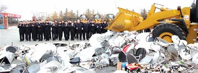 在前天的碾壓現(xiàn)場記者看見,一輛高達四五米的推土機已準備就緒,現(xiàn)場空地上擺滿了查繳的“小鍋蓋”、機頂盒等物品。平度市文化市場行政執(zhí)法局局長劉成愛
